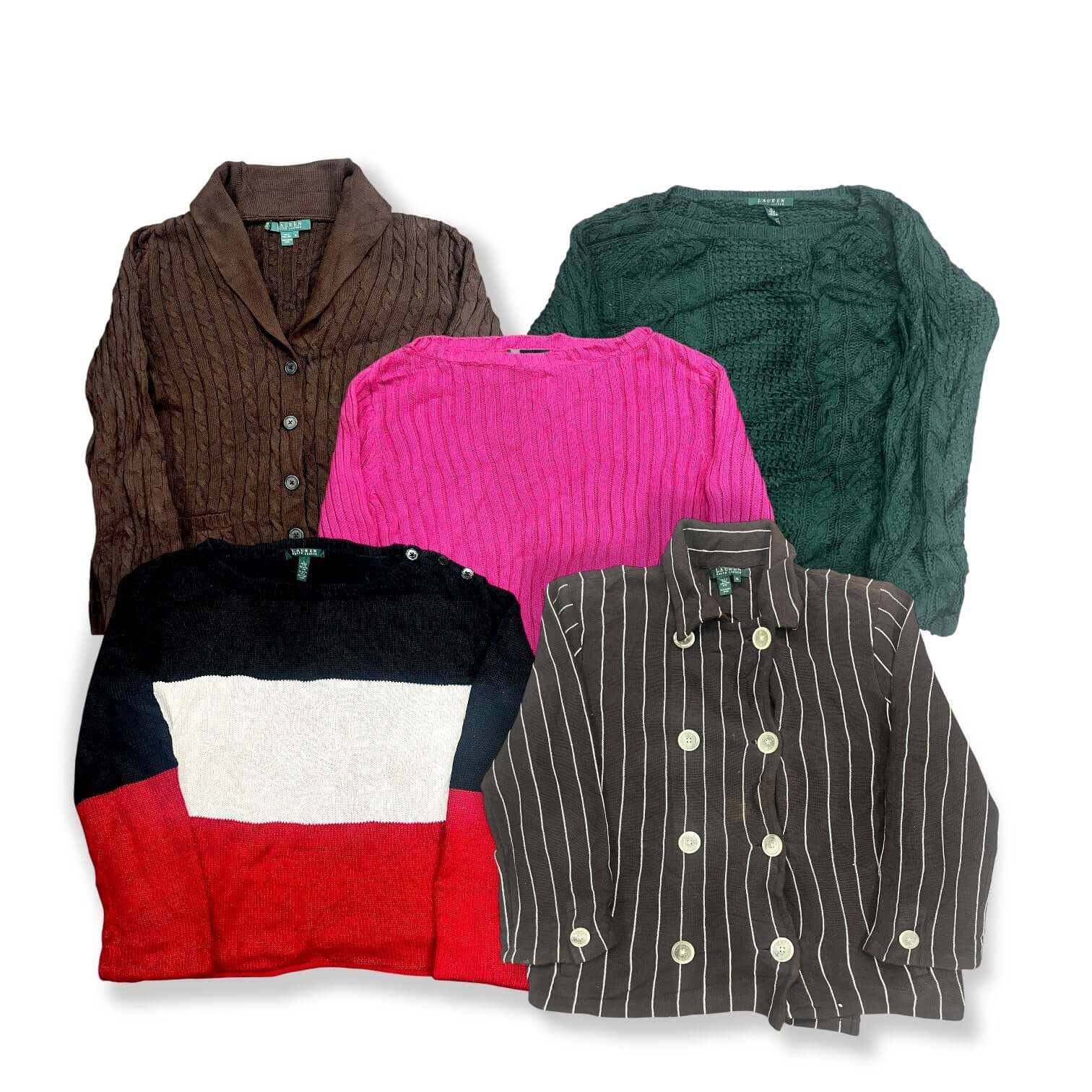 Une sélection de pulls femme Lauren Ralph Lauren (étiquette verte) et Tommy Hilfiger : pulls légers, pulls en maille, pulls coton, cols roulés, cols V, cardigans fins… Un mix élégant et intemporel, parfait pour friperies, boutiques vintage et e-shops.